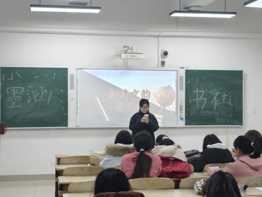 为破解同学们数字阅读下深度阅读与学科素养疏离困境,结合地理空间思维与人文阅读感知,传承人文素养、科学精神。墨涵书社于 2025 年 11 月 17 日在一教B408以比赛形式举办 “经纬文韵”朗诵比赛。