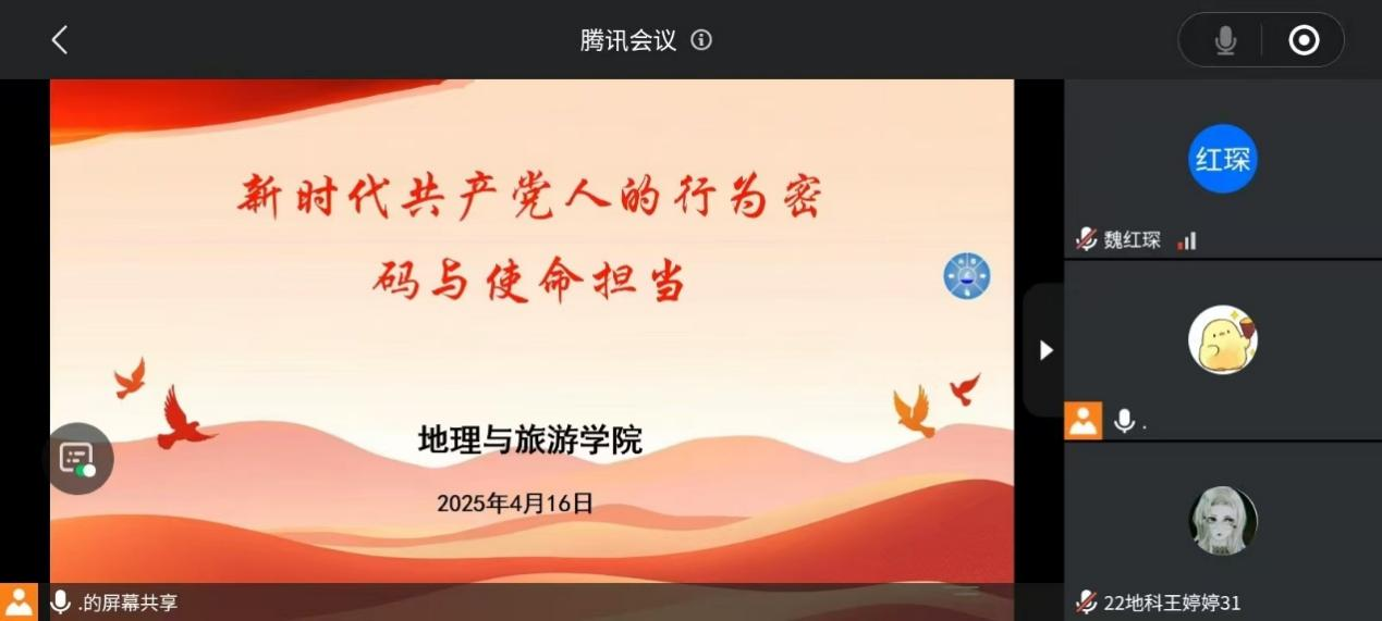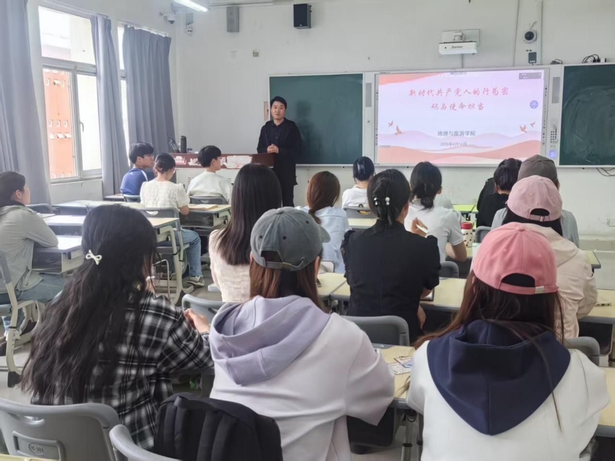 为强化入党积极分子与党员的思想政治教育,4月16日,地理与旅游学院党委书记秦拓以《新时代中国共产党人的行为密码与使命担当》为题,通过线上线下相结合的方式,为新一批入党积极分子和学生党员讲授专题党课。