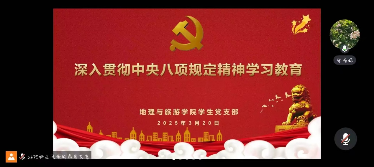 为深入学习贯彻习近平新时代中国特色社会主义思想,锲而不舍落实中央八项规定精神,进一步加强党员的作风建设,3月20日,齐鲁师范学院地理与旅游学院学生党支部通过线上会议的形式召开党员大会,开展主题党日活动。本次会议由学生党支部书记宋高娃主持,学生党支部全体党员参加。