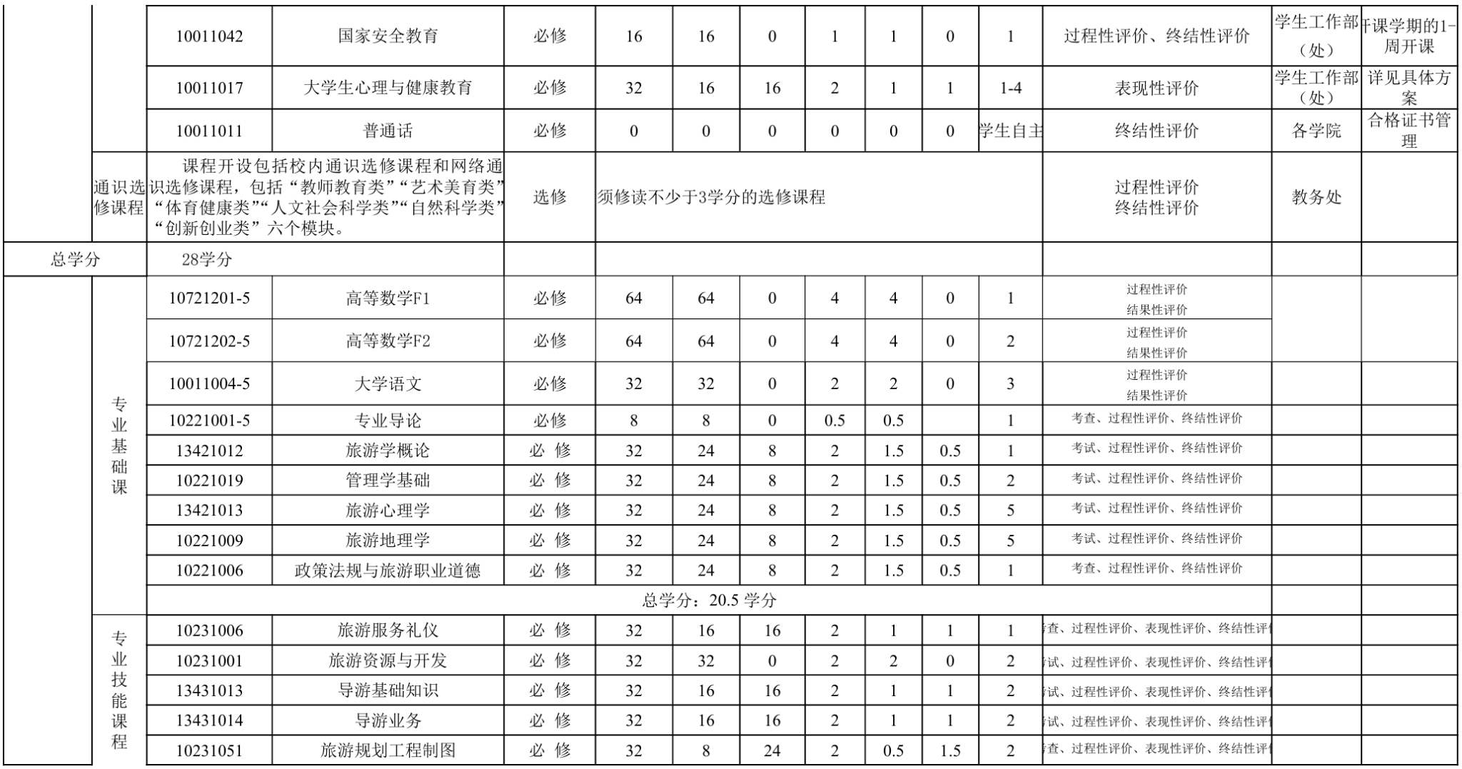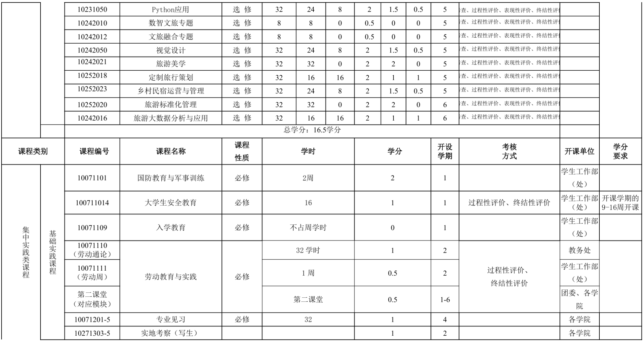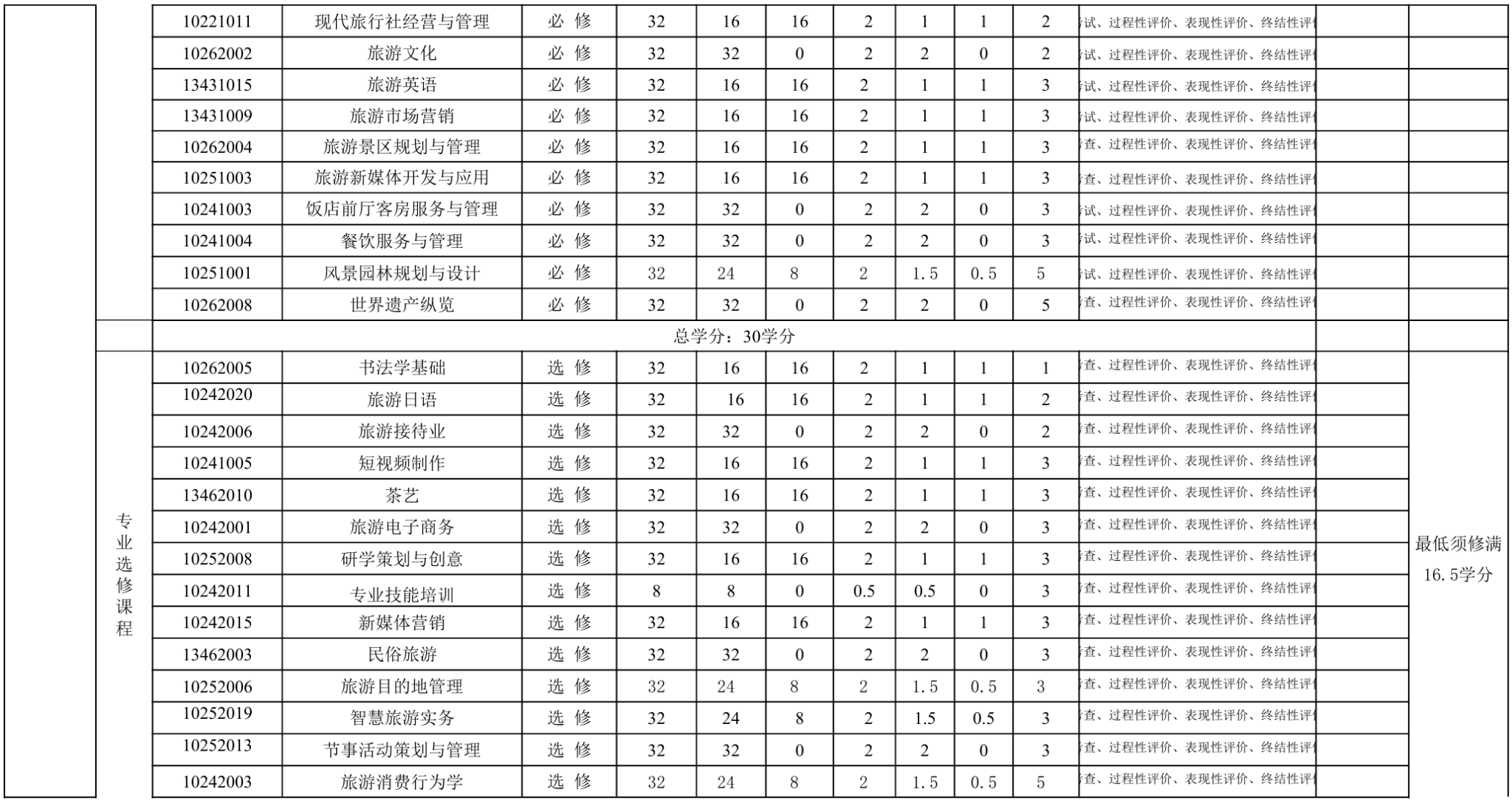 (3)专业实践:主要采用导游业务实训、旅行社业务实训、研学专题实训、旅游策划专题实训、旅游综合实训、顶岗实习、毕业实习、见习与劳动等。