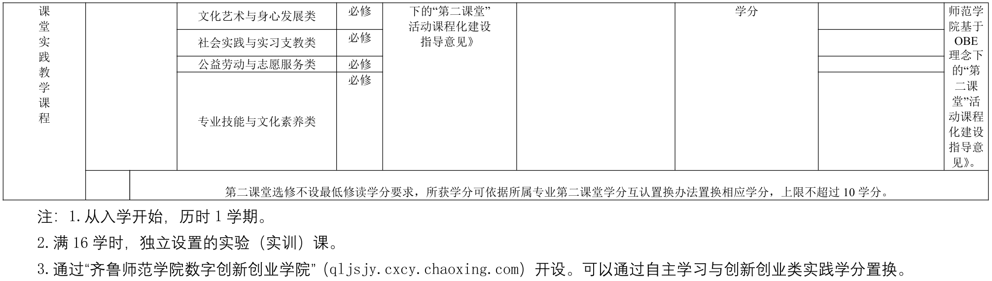 根据学院实际情况,结合《齐鲁师范学院基于OBE理念下的“第二课堂”活动课程 化建设指导意见》,第二课堂实践教学课程主要包括以下几类:1.理想信念与道德修养;2.科技学术与创新创业;3.文化艺术与身心发展;4.社会实践与实习支教;5.公益劳动与志愿服务;6.专业技能与文化素养