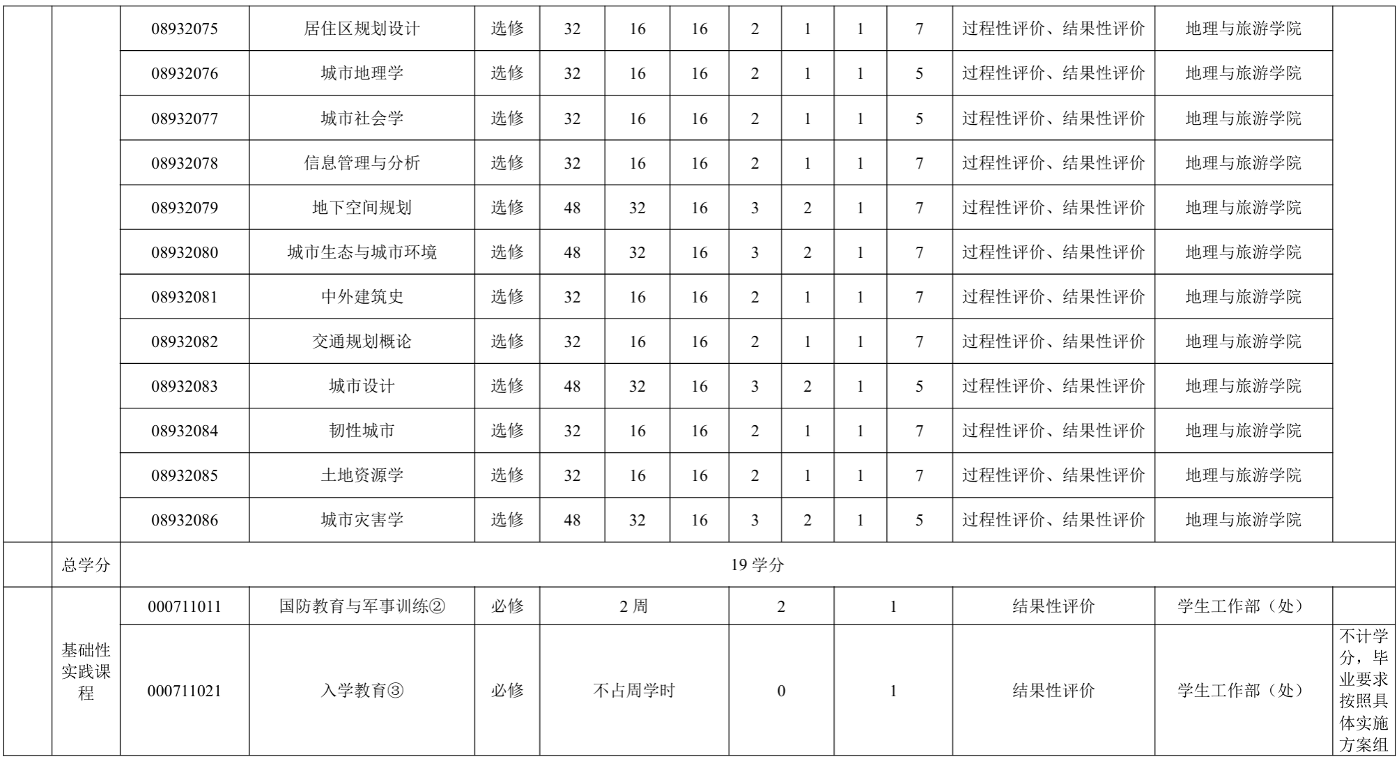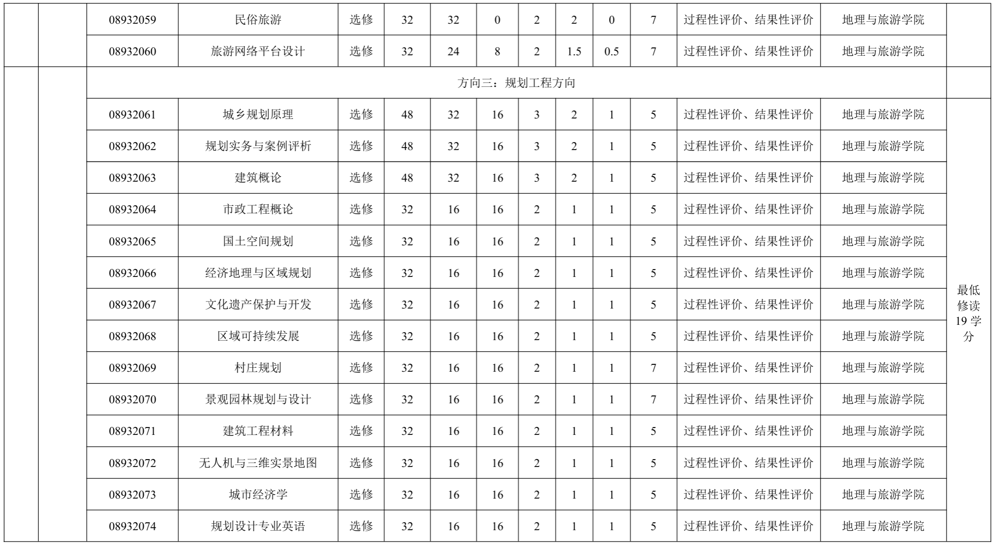主要实践性教学环节:国防教育与军事训练、旅游地学综合实习、旅游教育综合实习、规划设计综合实习、就业创业指导、创新创业教育实践、劳动教育、专业实习、毕业论文(设计)等。