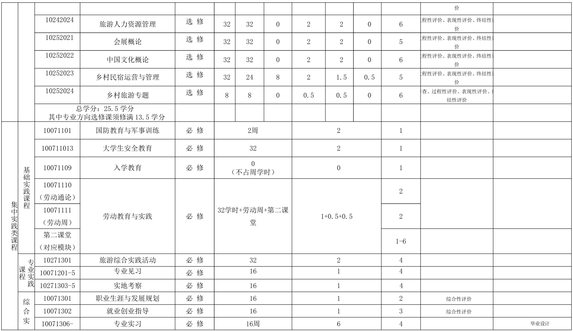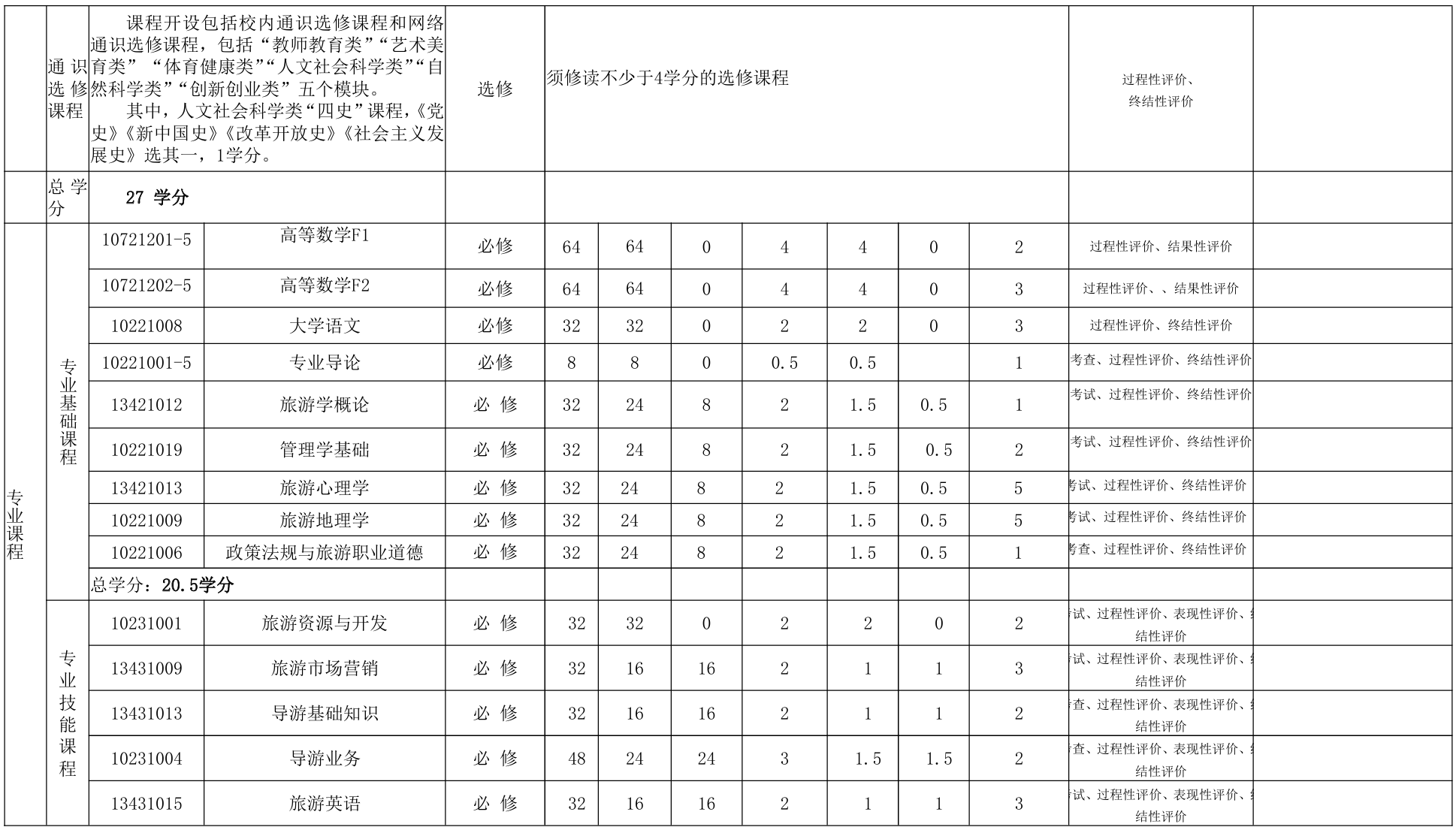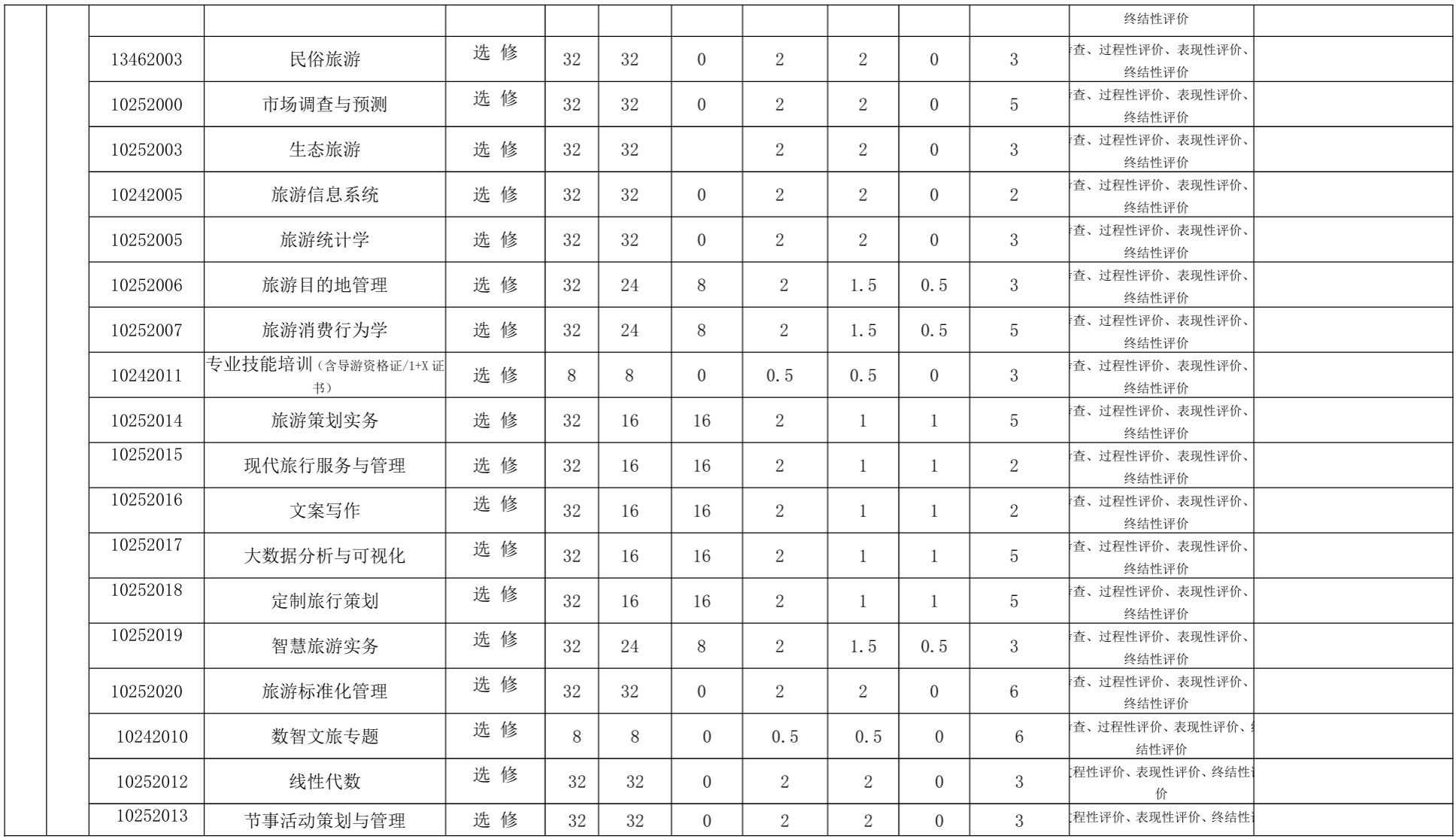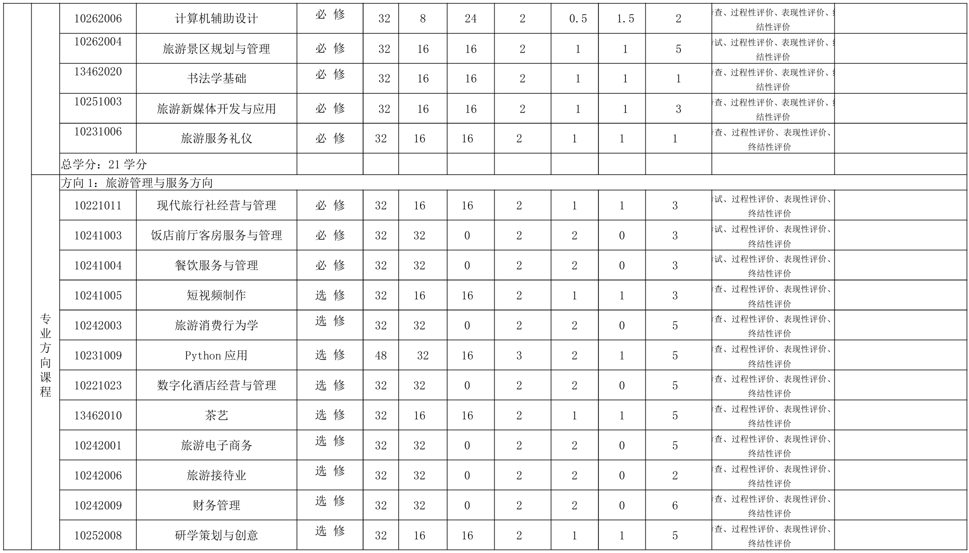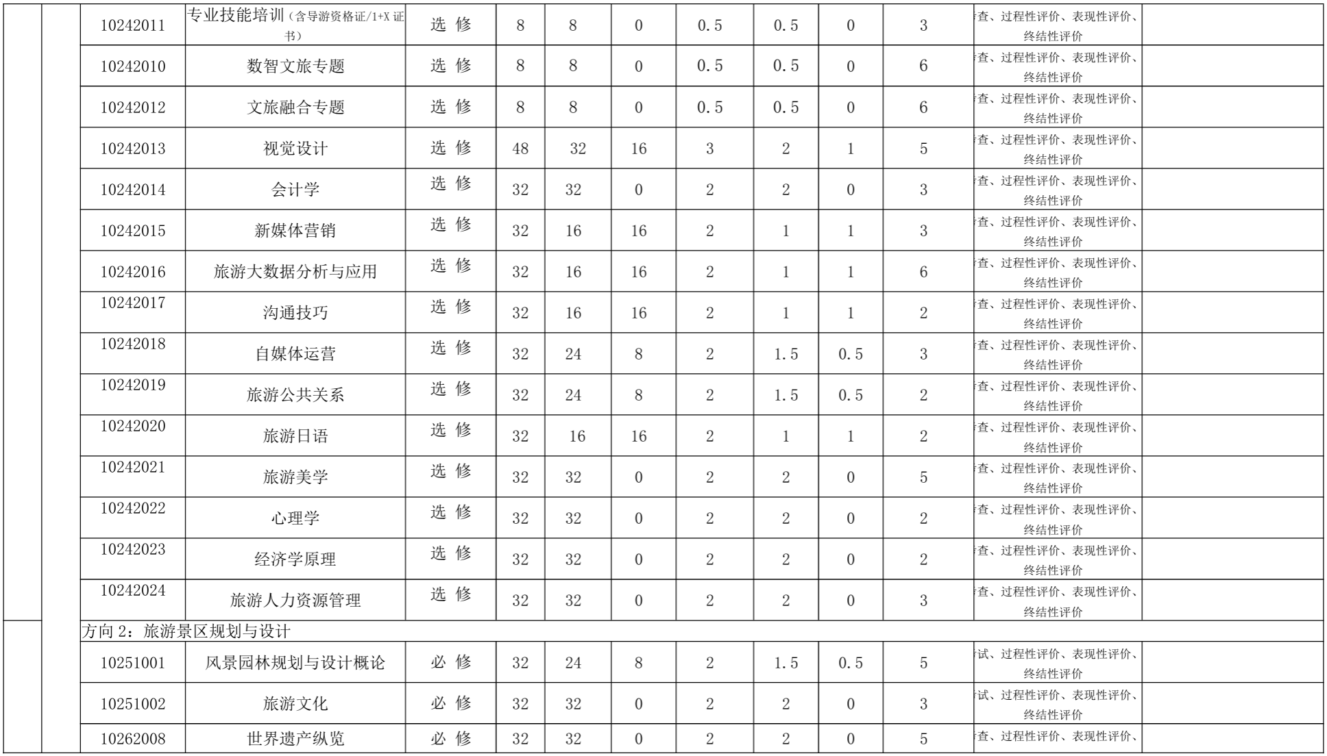 (3)专业实践:主要采用导游业务实训、旅行社业务实训、研学专题实训、旅游策划专题实训、旅游综合实训、顶岗实习、毕业实习、见习与劳动等。
