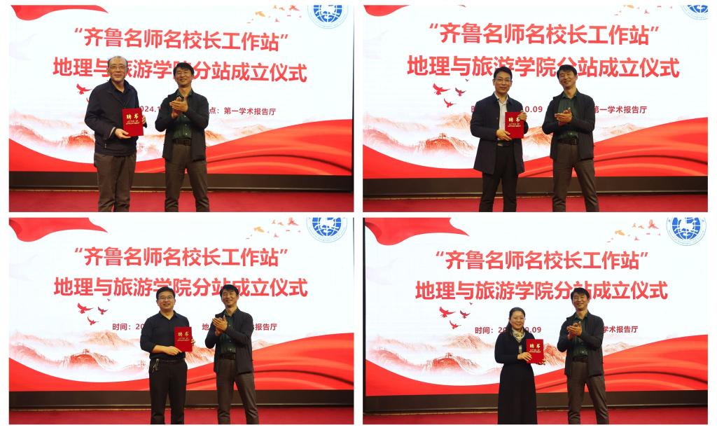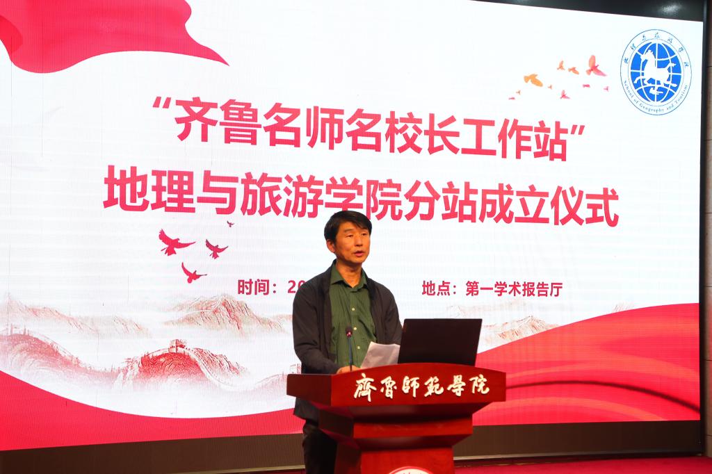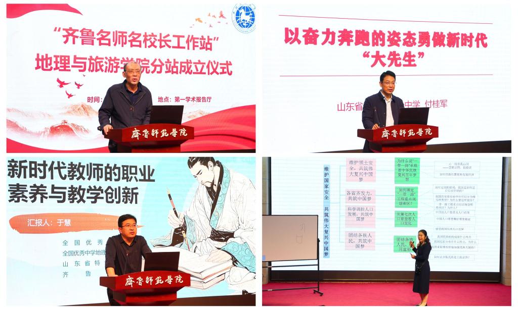 活动伊始,举行“齐鲁名师名校长工作站”地理与旅游学院分站成立仪式,仪式由王敏主持。宋新刚代表齐鲁师范学院对齐鲁名校长、齐鲁名师的到来表示热烈欢迎,他介绍了学校的基本情况,强调了此次分站成立的重大意义。陈树洪代表齐鲁名校长、名师进行致辞,他肯定了齐鲁师范学院在培养地理师范生方面取得的成绩,并对未来的教育事业发展进行了展望。宋新刚为出席本次活动的齐鲁名校长、齐鲁名师颁发了齐鲁师范学院特聘教授聘书。秦拓宣布“齐鲁名师名校长工作站”地理与旅游学院分站成立,并指出,分站的成立将为学院提供更多优质教学资源,助力学院在教育教学和人才培养方面取得进一步提升。