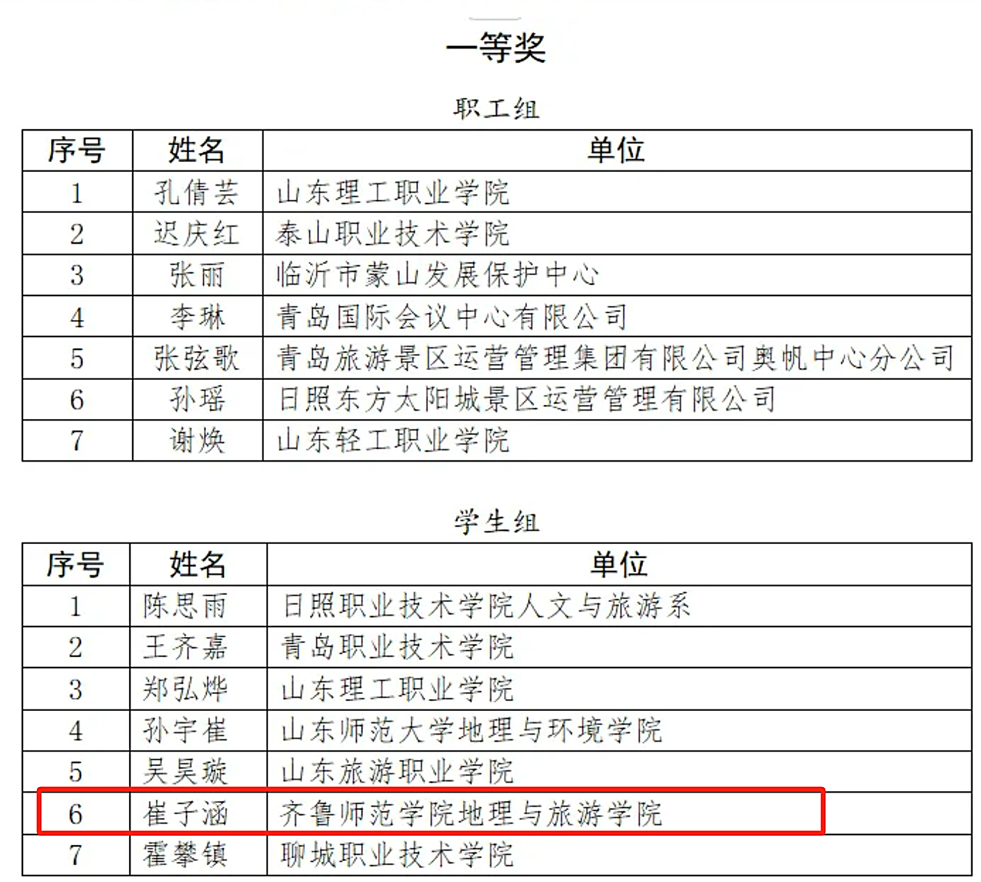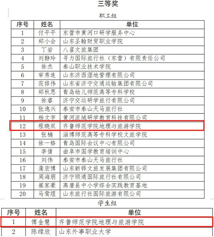 11月1日至3日山东省“技能兴鲁”职业技能大赛——2024年研学旅行指导师职业竞赛决赛在山东理工职业学院举行。我校地理与旅游学院教师程晓双与旅游管理与服务教育专业崔子涵、傅金慧两名同学在众多选手中脱颖而出,分别获职工组三等奖和学生组一等奖、三等奖,我校获优秀组织奖。