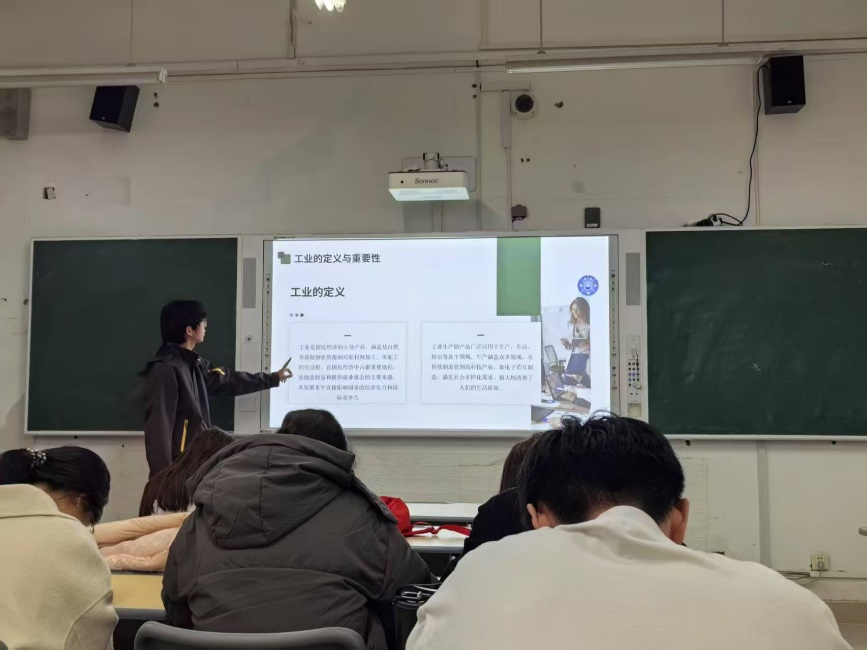 第二位主讲人王思邈同学聚焦“工业革命与现代智能制造”,梳理了工业发展的历史脉络,并重点分析了人工智能、物联网等技术如何推动产业升级。PPT中穿插的国内外工业对比,引发了同学们对技术创新与可持续发展的深入思考。
