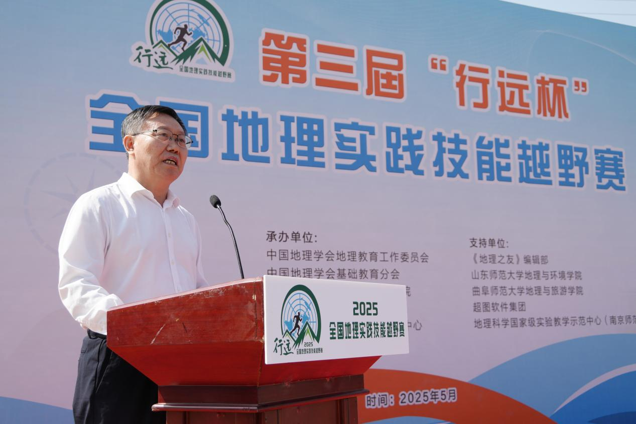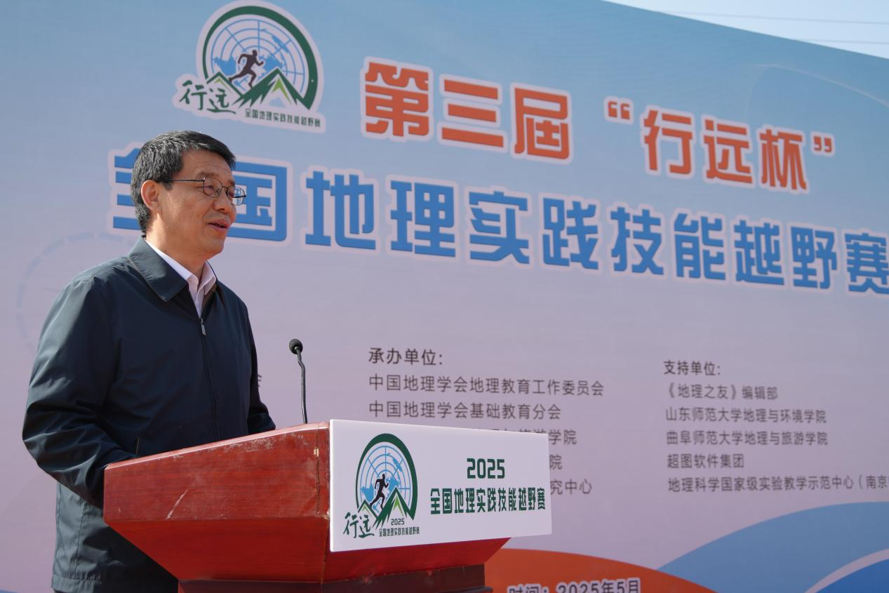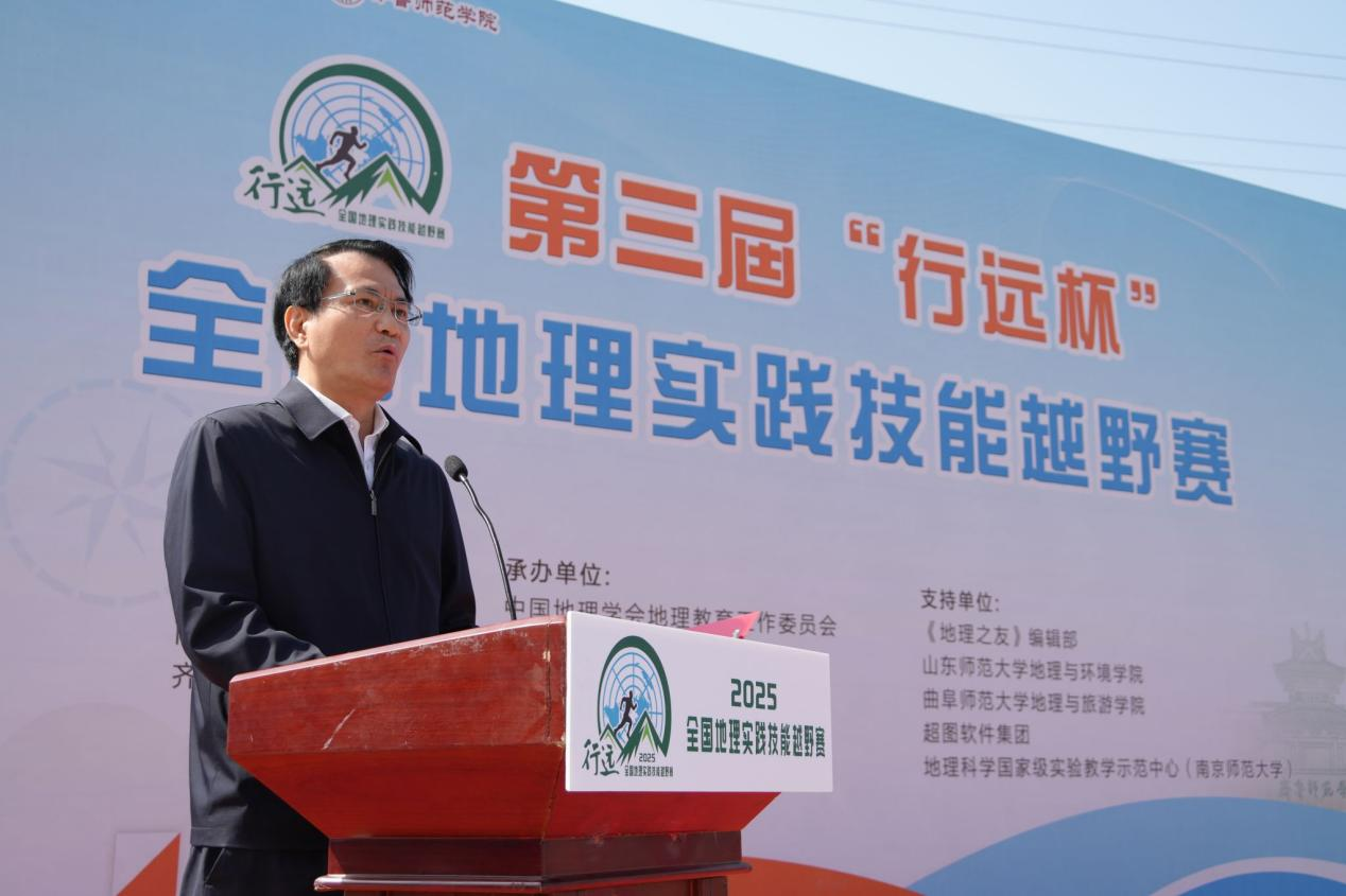 曾宪文代表山东省教育厅祝贺赛事成功举办,指出野外考察实践对人才培养、教育范式转换及服务国家战略的重要意义,强调赛事落户山东的积极作用,并提出保证办赛水准、强化成果运用、深化科教融合的殷切期望。