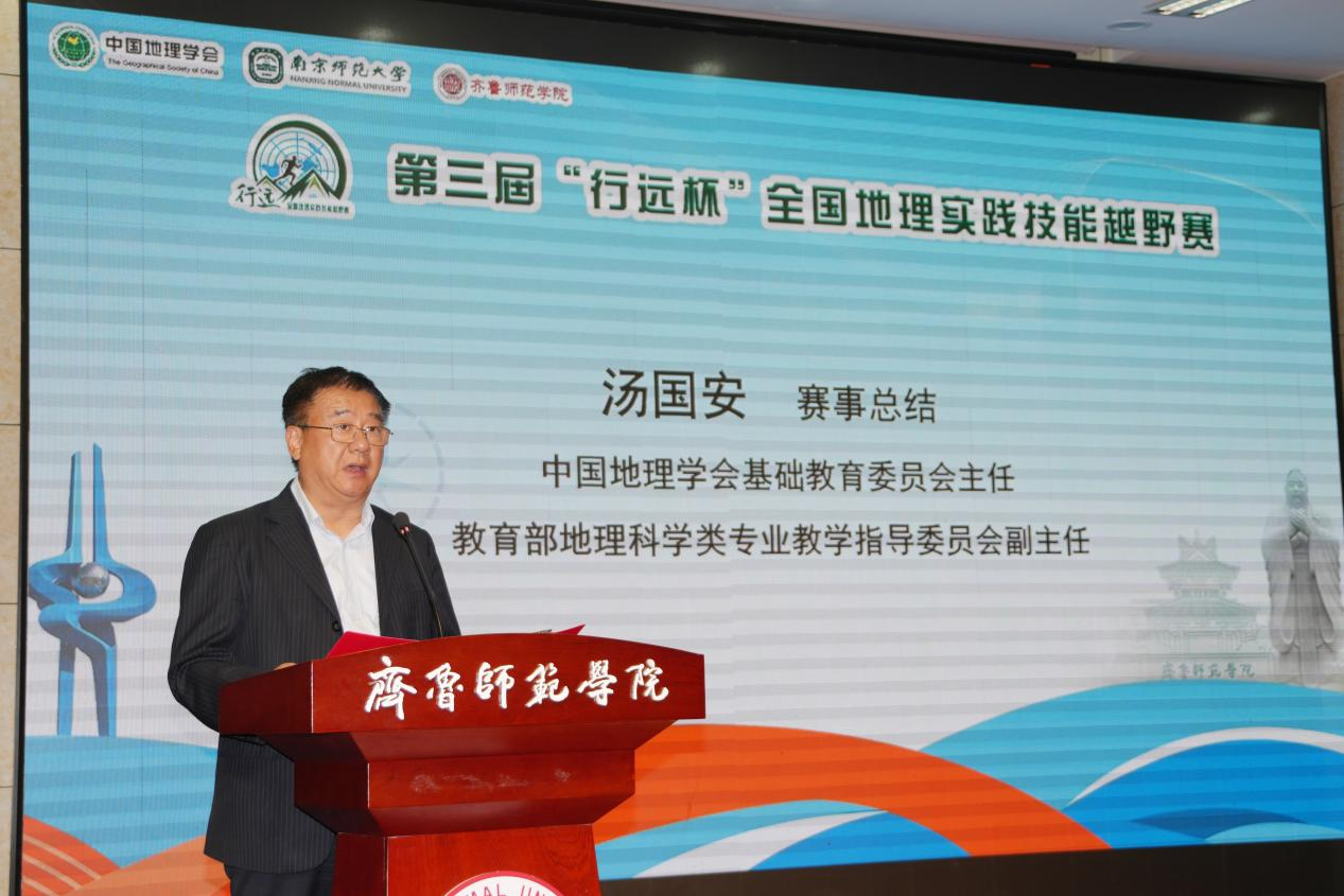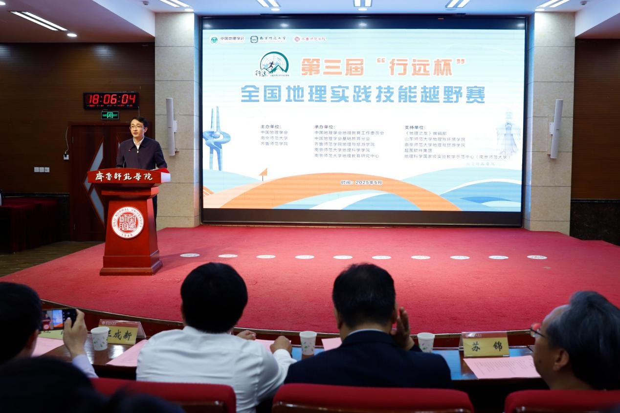 参赛选手代表发言,表达了公平参赛、互学互鉴的竞赛态度。汤国安向齐鲁师范学院地理与旅游学院授旗。与会领导嘉宾共同上台鸣响发令器,第三届“行远杯”全国地理实践技能越野赛正式开幕。