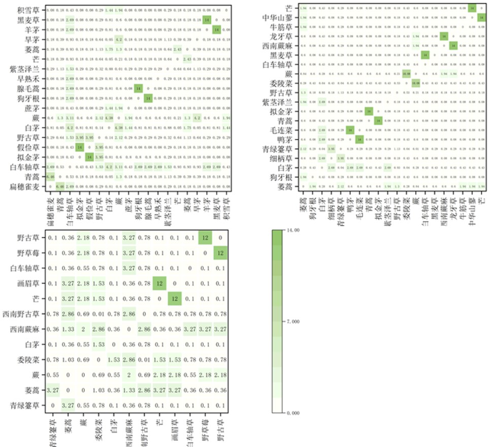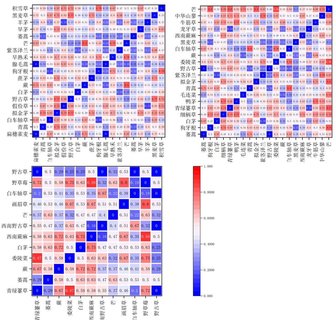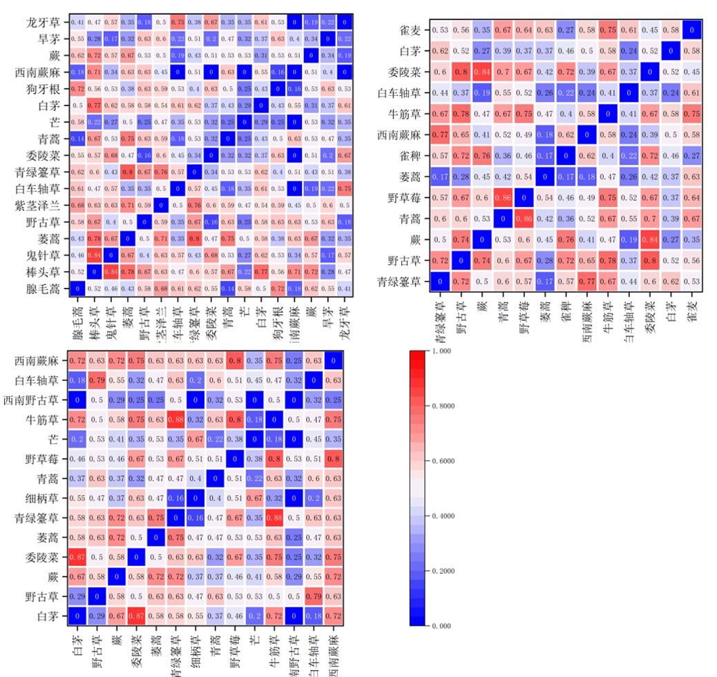 研究通过对三个海拔梯度(1900-2200m、2200-2500m、2500-2800m)草地小班的数据分析,结合χ²检验、Spearman相关系数、AC联结系数和Ochiai指数等方法,揭示了以下关键发现: