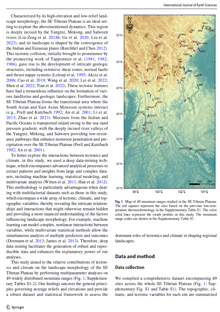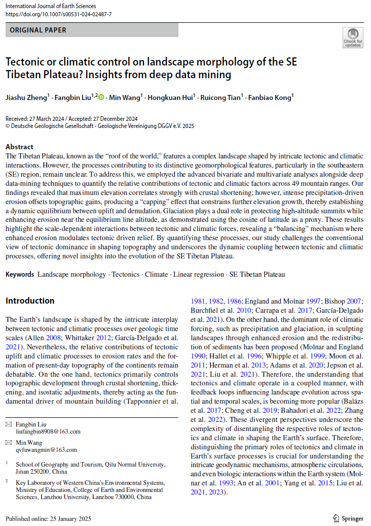 近日,地理与旅游学院2022级地理科学本科生郑嘉澍在刘方斌副教授的指导下,以第一作者身份在中科院三区期刊《International Journal of Earth Sciences》上发表了题为《Tectonic or climatic control on landscape morphology of the SE Tibetan Plateau? Insights from deep data mining》的学术论文。该研究得到了国家自然科学基金和齐鲁师范学院科研启动专项资助。
