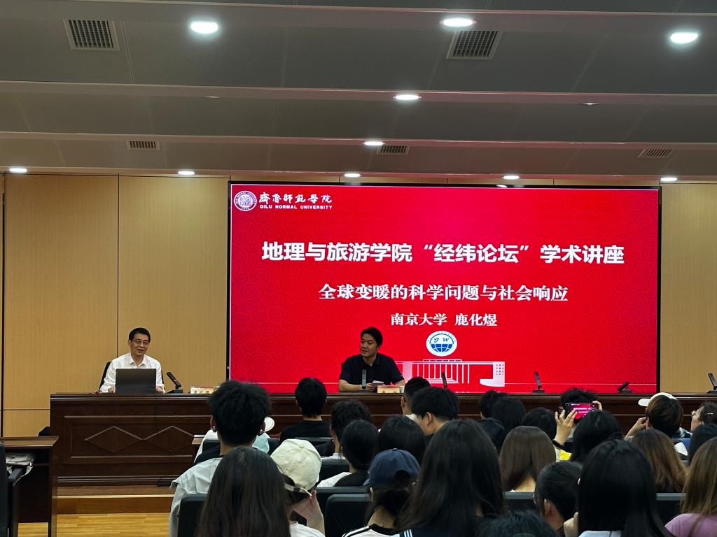 5月17日下午,由地理与旅游学院主办的第22期“经纬论坛”讲座在章丘校区第二学术报告厅举行。中国地理学会副理事长、南京大学地理与海洋科学学院教授、博士生导师鹿化煜应邀作《全球变暖的科学问题与社会响应》专题报告。论坛由地理与旅游学院党委书记秦拓主持,地理科学专业全体学生及部分教师现场聆听。