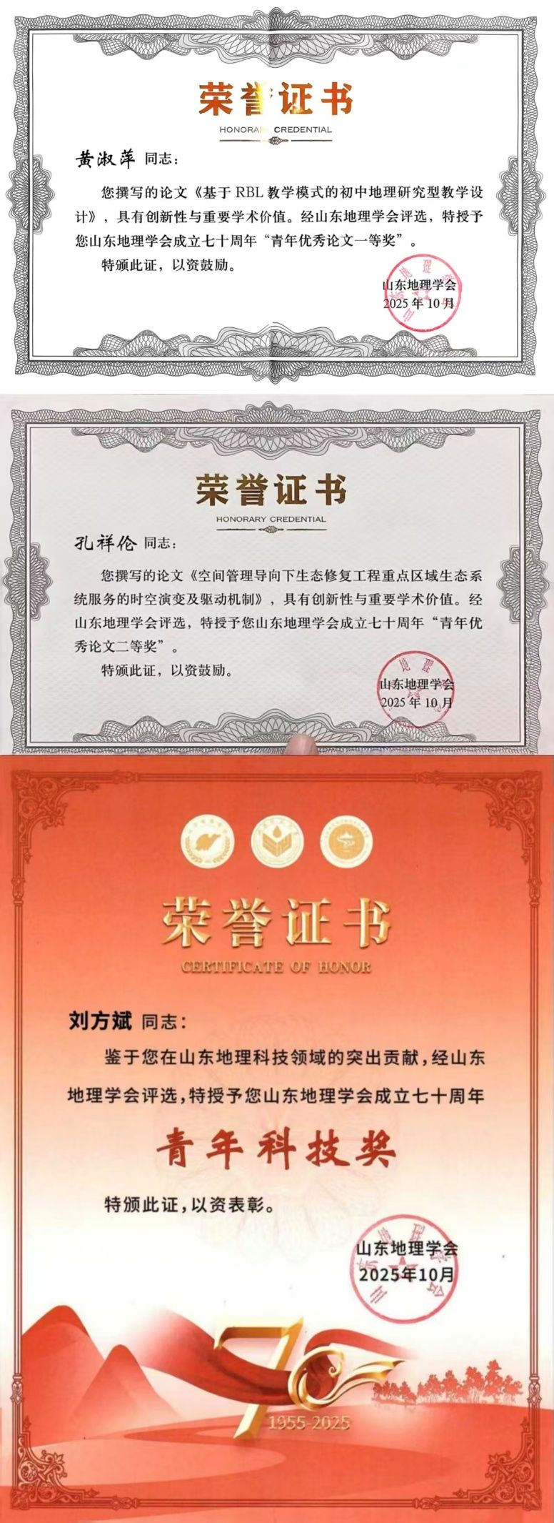 在学会嘉奖环节,陈国忠荣获“山东地理学会突出贡献奖”,旨表彰其在山东地理事业发展中所做的突出贡献。刘方斌凭借在“河流景观演化”、“地震学”、“低温热年代学”等学科领域取得突出成果,荣获“山东地理学会青年科技奖”。在优秀青年论文评选中,黄淑萍荣获一等奖,孔祥伦获得二等奖。
