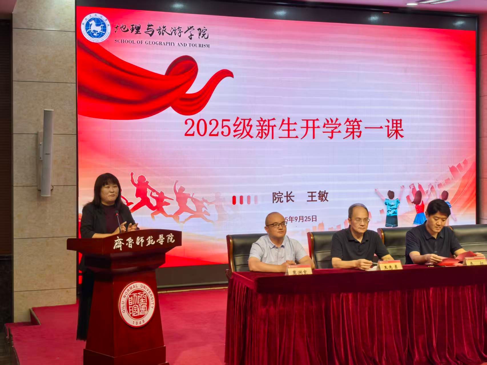 9月25日,齐鲁师范学院地理与旅游学院2025级新生见面会在第一学术报告厅举行。学院党委书记秦拓、院长王敏、党委副书记王志勇、副院长郭斐、惠洪宽,团总支书记宋高娃,辅导员徐媛媛、片康及新生班主任与2025级全体新生参与会议,会议由副院长郭斐主持。
