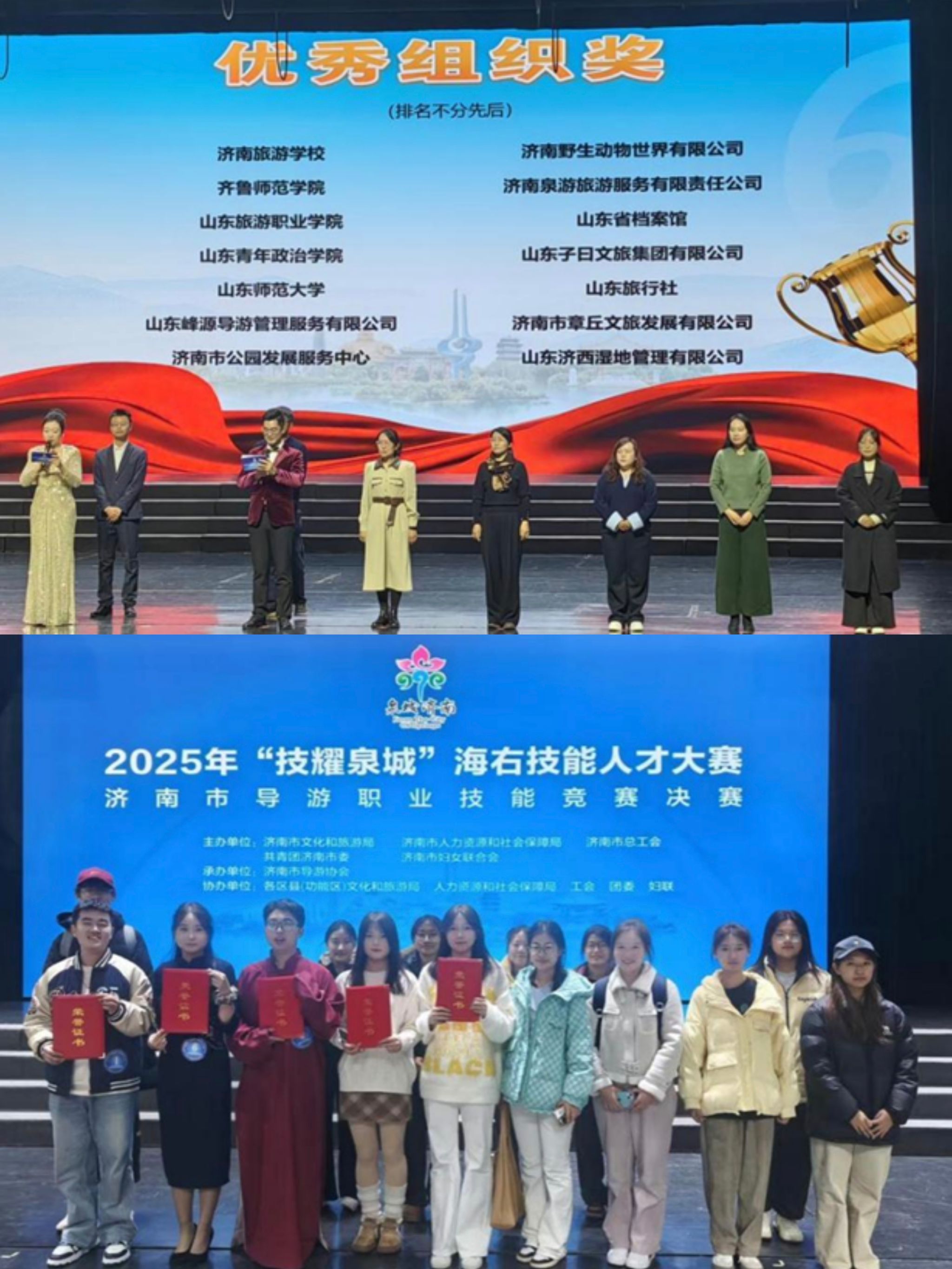 本次大赛以“选拔精英、孵化新星、擦亮名片”为宗旨,旨在全面提升文旅行业从业者综合素养。自今年9月份启动以来,大赛吸引超千名选手参赛,覆盖一线导游、讲解员、高校学生及文旅爱好者。学院组建由董晓红、王燕、程晓双、袭著高等教师构成的指导团队,积极组织学生备赛,从校赛、市复赛到市决赛一路过关斩将。最终,在总决赛“未来之星组”10强比赛中,旅游管理与服务教育专业朱晗宁、李恒哲、张淦三名学生凭借生动流畅的讲解、精彩绝伦的才艺展示,均荣获三等奖;“文旅推荐官”赛道上,程晓双老师和旅游管理专业孙飞艳、张鑫雨两位学生提交的济南文旅原创视频,从37部入围作品中脱颖而出,成功进入10强,分别荣获三等奖。此外,学校荣获“优秀组织奖”,进一步印证了学校在技能人才培养方面的综合竞争力与行业认可度。
