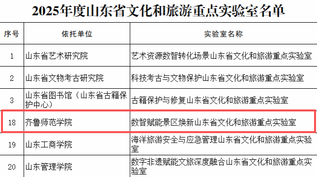 近日,山东省文化和旅游厅公示了2025年度山东省文化和旅游重点实验室入选名单。学校申报的“数智赋能景区焕新山东省文化和旅游重点实验室”成功获批。这是我校在省级高水平科研平台建设方面取得的又一重要进展,标志着学校在推动文旅深度融合、服务山东文旅高质量发展方面的科研创新能力取得重大进步。
