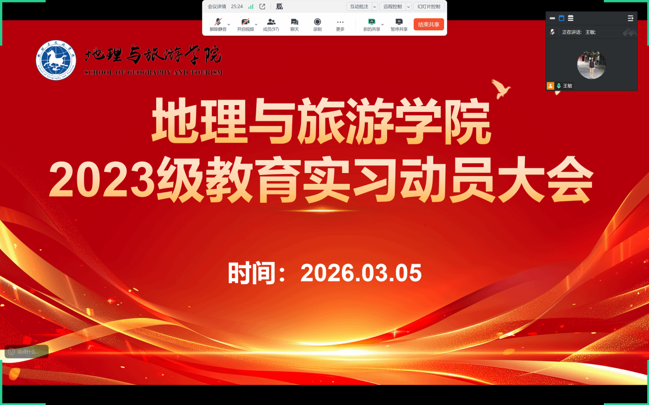 为扎实推进地理科学专业师范生教育实习工作,明确实习目标与要求,3月5日晚19:30,齐鲁师范学院地理与旅游学院召开2023级地理科学专业师范生实习动员大会。会议由团总支书记宋高娃主持,学院党委书记秦拓、院长王敏、党委副书记王志勇、副院长郭斐,惠洪宽、地理学科教学团队负责人付桂军、地理科学教研室主任张冰、实习指导老师及2023级地理科学专业全体学生参加会议。