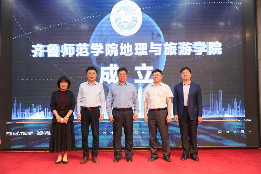 会上,举行了齐鲁师范学院地理与旅游学院成立仪式,郑新奇、王庆、林松柏、王成新、王敏共同上台为齐鲁师范学院地理与旅游学院成立揭牌。