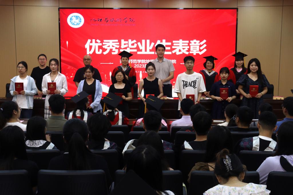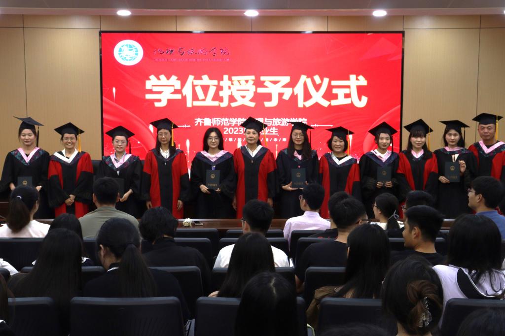 奏唱国歌之后,地理与旅游学院党委书记秦拓宣读优秀毕业生获奖名单,并为他们颁发荣誉证书。随后举行学位授予仪式,杨乐英等六位教授为获得学士学位的同学拨穗并颁发学士学位证书。