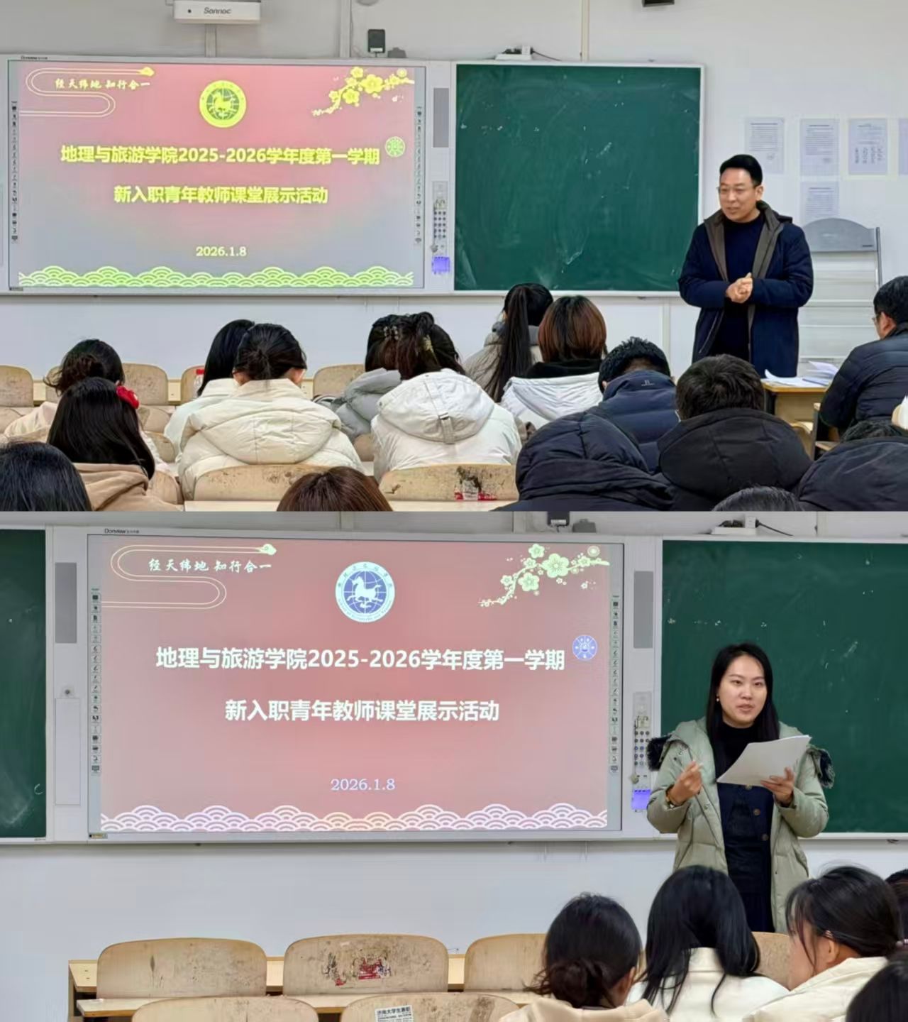为夯实青年教师教学基本功、全面提升学院教育教学质量,2026年1月8日,地理与旅游学院举办2025-2026学年第一学期青年教师课堂展示活动。38名青年教师登台展示,学院领导、教学督导组成评议组全程指导,全院教师观摩学习。