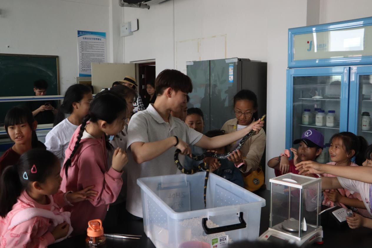 第五站:生物标本实验室。在二号实验楼A414,张冰老师团队围绕蛇、蜥蜴等动物进行科普讲解,普及生物多样性知识,进一步增强了同学们的生态保护意识。